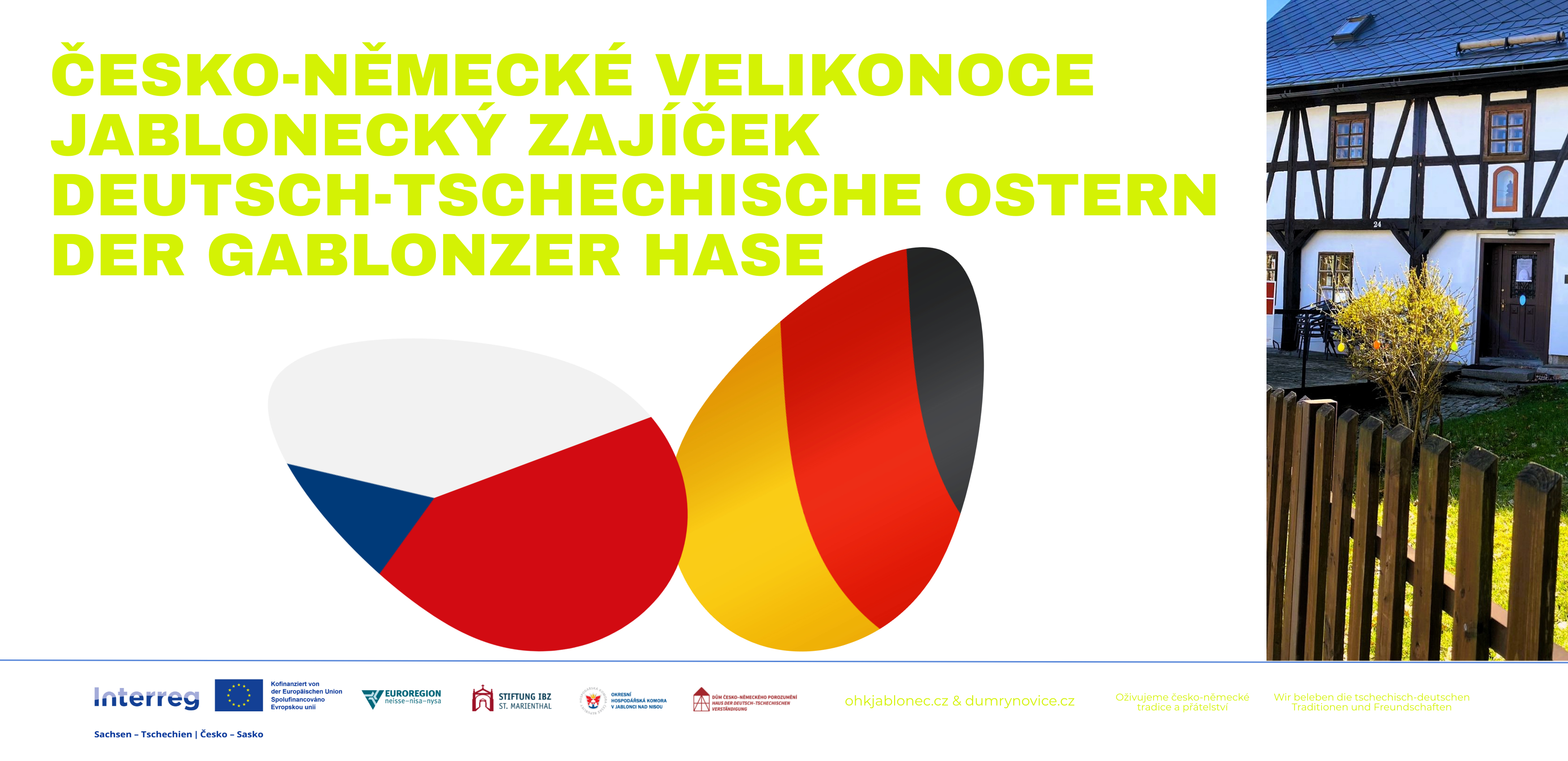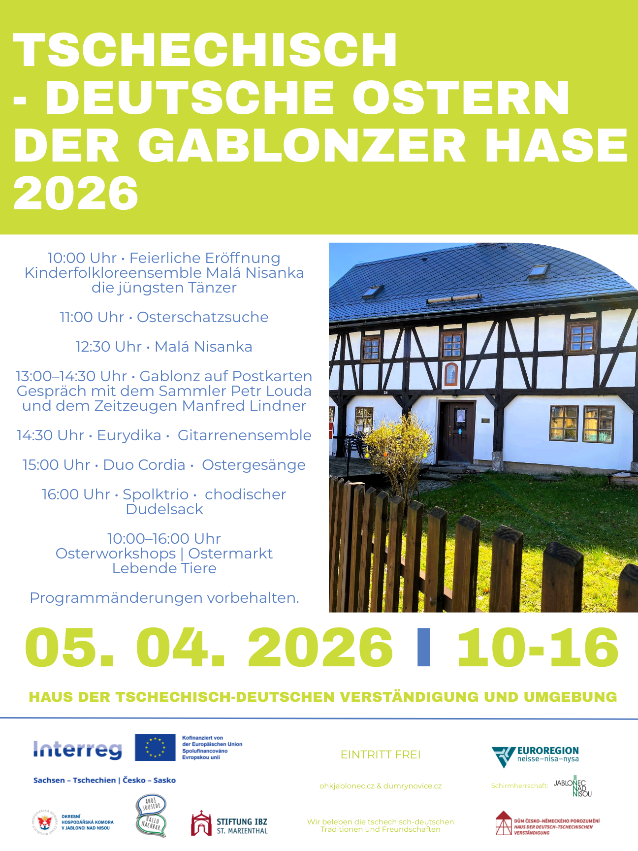Um an die gemeinsamen Traditionen der Osterzeit zu erinnern, organisieren wir für die breite Öffentlichkeit auf beiden Seiten der Grenze die Veranstaltung „Jablonecký Zajíček 2026” (Deutsch-tschechische Ostern der Gablonzer Hase 2026). Die Veranstaltung findet am Ostersonntag, dem 5.4.2026, in Rýnovice bei Jablonec in der Nähe des Hauses der tschechisch-deutschen Verständigung statt. Freuen Sie sich auf einen kleinen Ostermarkt mit regionalem Kunsthandwerk (regionale Hersteller und Verkäufer von beiden Seiten der Grenze, einschließlich Vorführungen der Herstellung der angebotenen Produkte), Musik- und Tanzaufführungen von Ensembles und Künstlern aus der Grenzregion zum Thema Ostern und lokale Traditionen, tschechische und deutsche Traditionen live, eine Schatzsuche des Osterhasen, das Flechten von Osterruten, thematische Erzählungen von Experten über die Geschichte der Stadt und der gesamten tschechisch-deutschen Grenzregion, Vorführungen und Lesungen aus historischen Postkarten, Osterworkshops – Kreativworkshops für Jung und Alt, lebende Ostertiere.